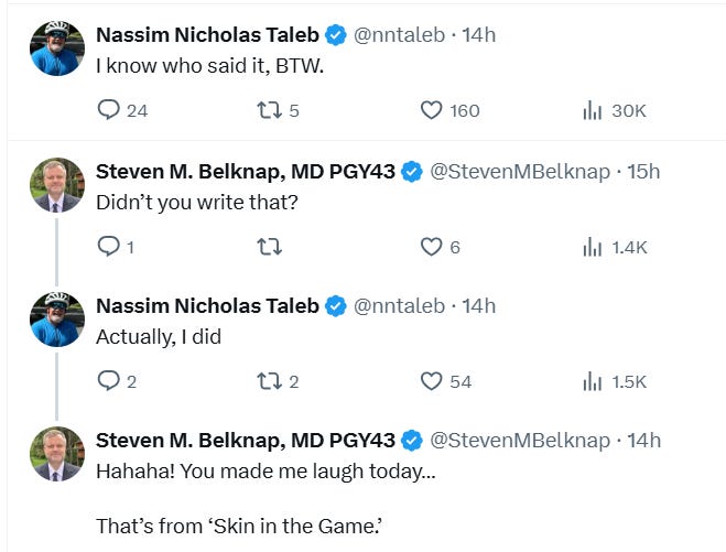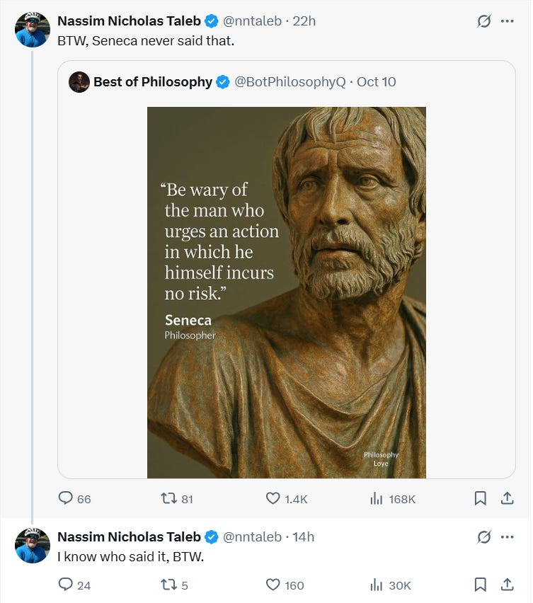 “Actually, I said this. Me, me, me!” Whoever said the quote in the Taleb’s repost (the exact quote is attributed to Joaquín Setantí, according to Google) was not the first to express this relatively banal and old idea.